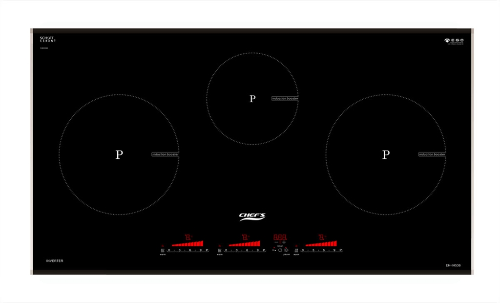 Thiết bị Chef's EH-IH536 là dòng bếp từ ba vùng nấu sử dụng hệ thống linh kiện nhập khẩu trực tiếp từ tập đoàn E.G.O (Đức) và được lắp ráp tại Việt Nam. Sản phẩm là sự kết hợp giữa sức mạnh công suất 6800W và công nghệ Inverter vượt trội, mang lại khả năng vận hành êm ái, ổn định và hiệu quả kinh tế cao cho người nội trợ.
