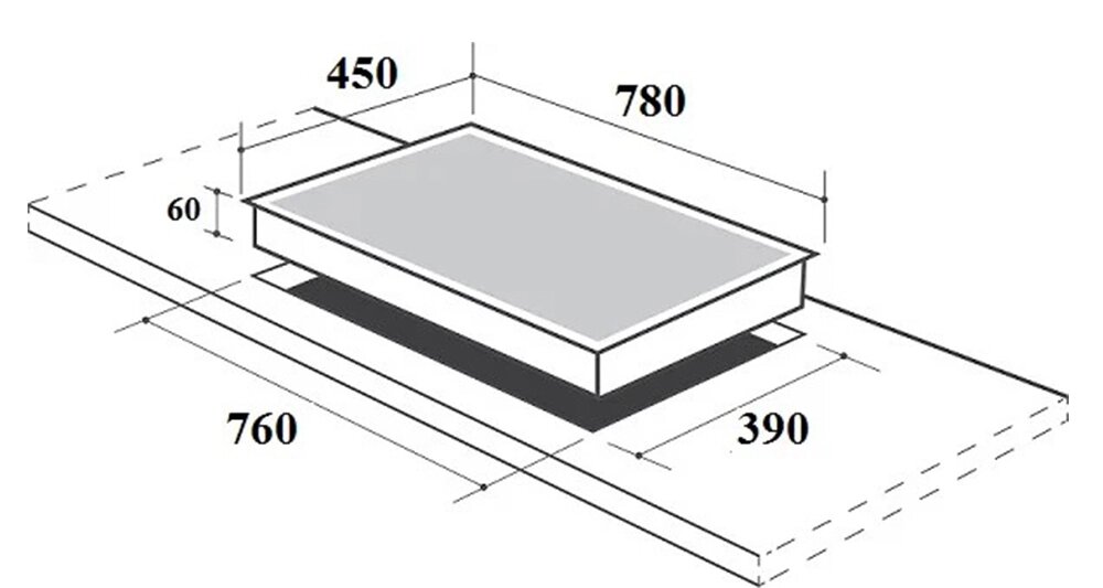 • Thông thường kích thước bề mặt của bếp ba lớn hơn (780x450mm). Bạn cần kiểm tra kỹ kích thước khoét đá hiện tại; nếu nhỏ hơn mức 760x390mm, bạn sẽ cần thợ đá hỗ trợ mở rộng thêm lỗ đá.