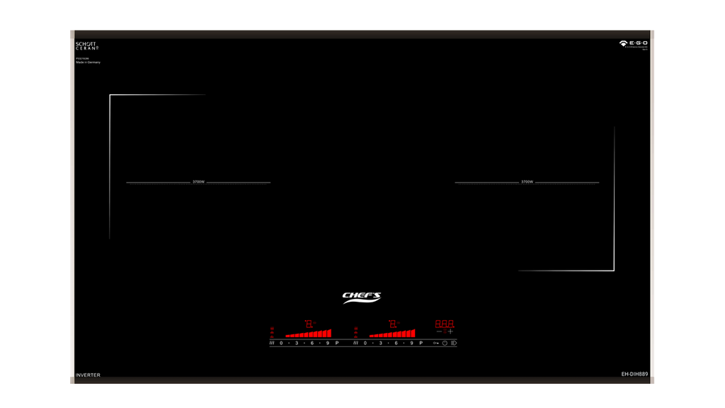 Bếp từ đôi Chefs EH-DIH889 là model tiêu biểu trong dòng Serie 8 của Chef's, được nhập khẩu nguyên chiếc từ CHLB Đức. Sản phẩm gây ấn tượng mạnh với giao diện vùng nấu cách điệu tối giản, đi kèm hệ thống linh kiện E.G.O bền bỉ, đáp ứng nhu cầu đun nấu cường độ cao của người nội trợ Việt.