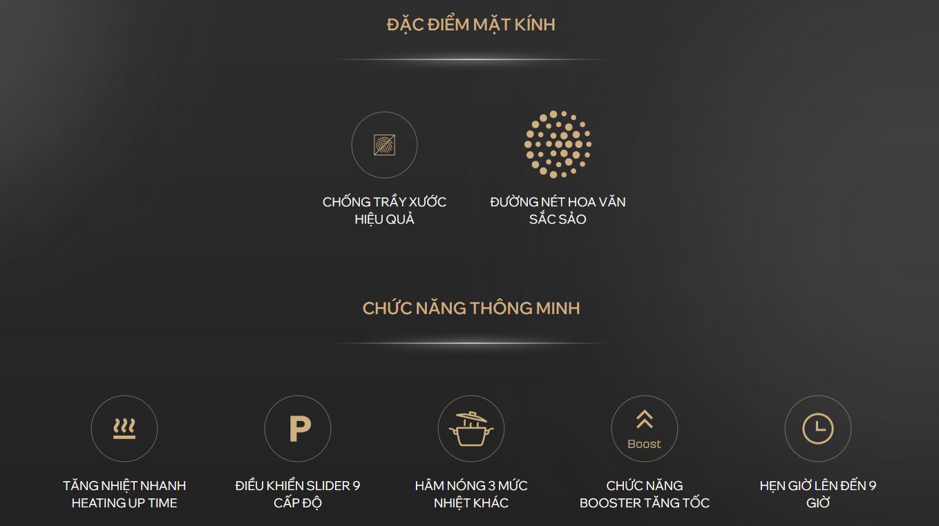 Mỗi vùng nấu có công suất tiêu chuẩn cao và hỗ trợ Booster lên đến 3000W, giúp đun sôi nhanh, xào nấu mạnh lửa khi cần, đặc biệt hữu ích với các món chiên, xào hoặc đun nước số lượng lớn.