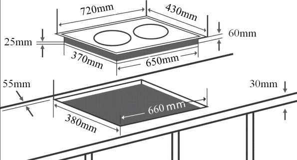 Kích thước lắp đặt: Sản phẩm có kích thước phủ mặt 720x430 mm, tương ứng với kích thước khoét đá tiêu chuẩn 660x380 mm.