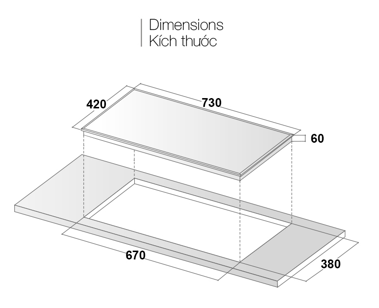 Vùng nấu rộng rãi: Hai vùng nấu từ đường kính $\varnothing 230 \text{ mm}$ phù hợp với nhiều kích cỡ nồi chảo khác nhau.