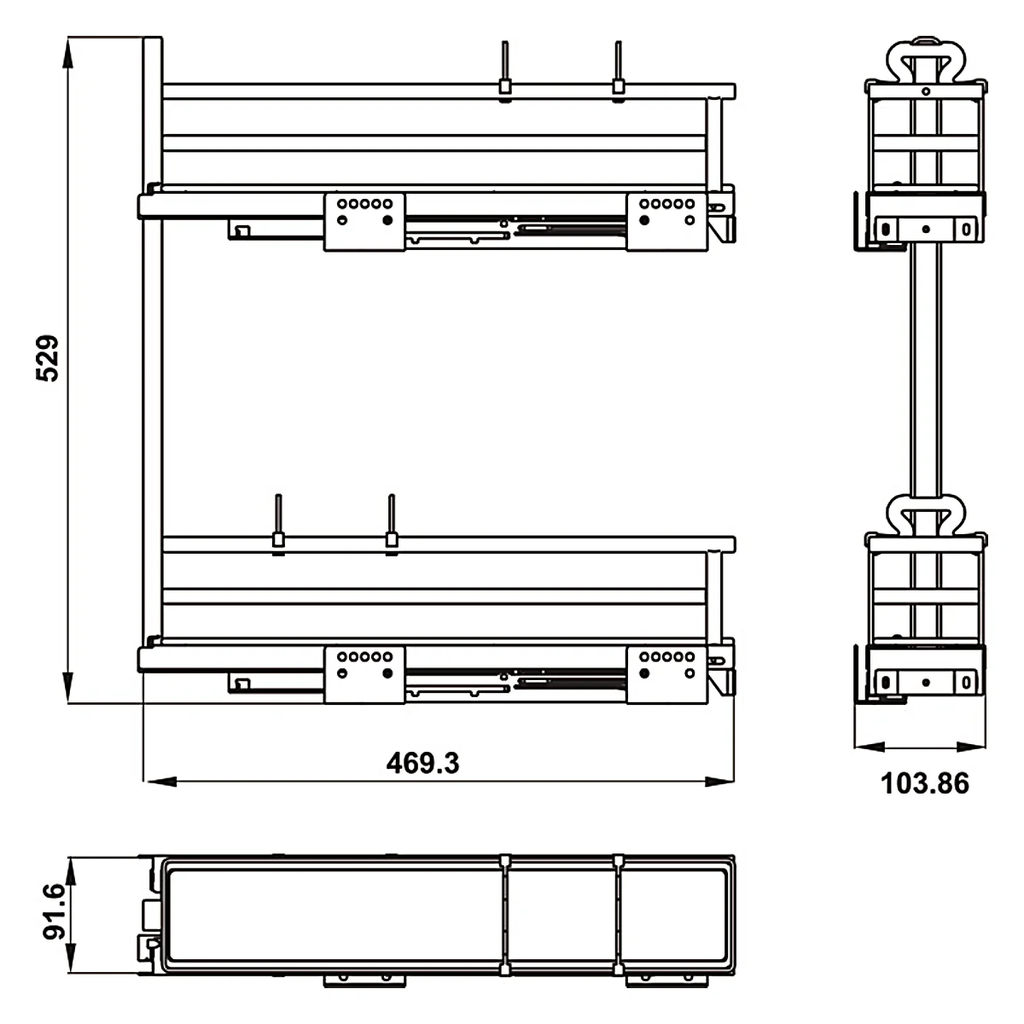 Ray trượt giảm chấn lắp phải: Hệ thống ray bắt trực tiếp vào vách bên phải, giúp rổ chuyển động mượt mà, êm ái và không gây tiếng ồn khi đóng mở.