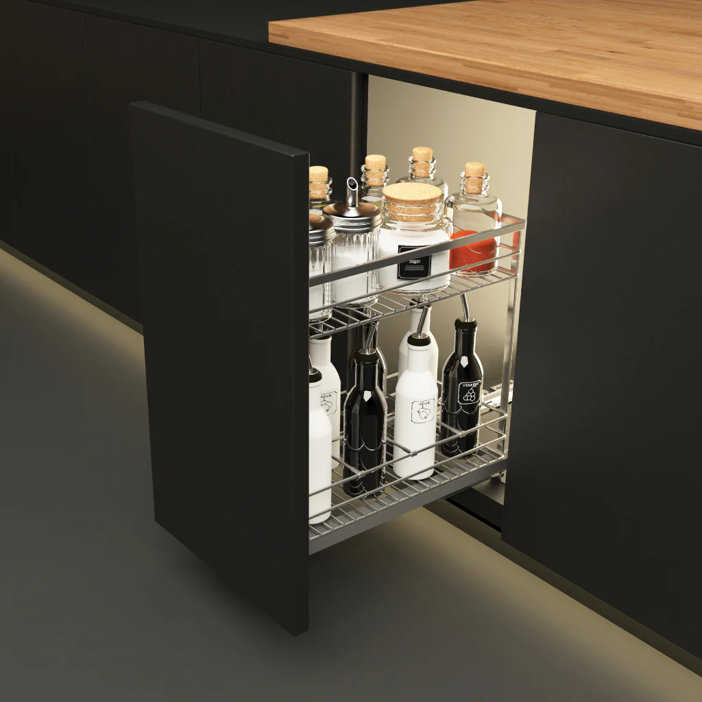 Tối ưu không gian nhỏ: Với chiều rộng thực tế chỉ 164mm, rổ tận dụng triệt để những hộc tủ hẹp bên cạnh bếp nấu, giúp thao tác lấy gia vị khi nấu nướng trở nên nhanh chóng hơn.