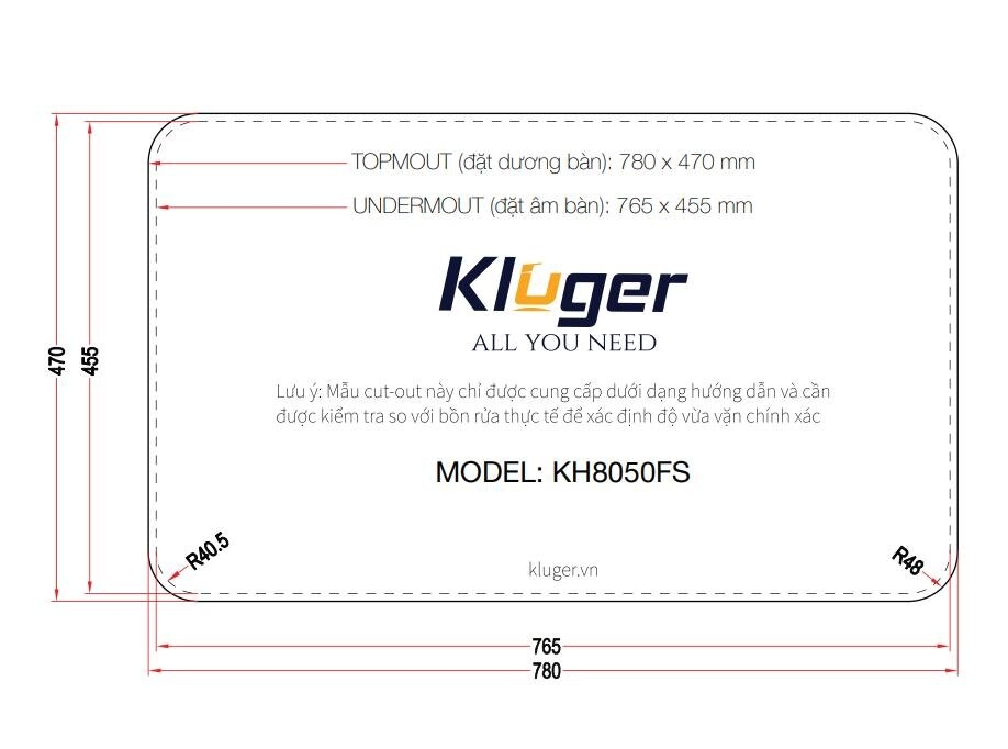 | Cắt đá lắp âm | 765 x 455 mm (Bo góc 4R40) |