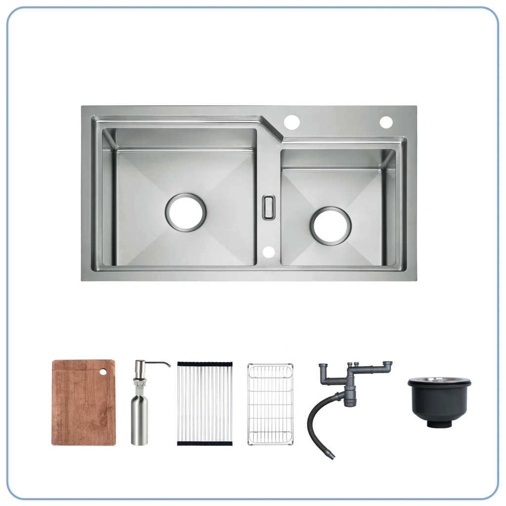Giá bán trọn gói: Đã bao gồm bộ phụ kiện cao cấp (Thớt gỗ + Rổ LK + Dây lưới + Bình xà phòng).