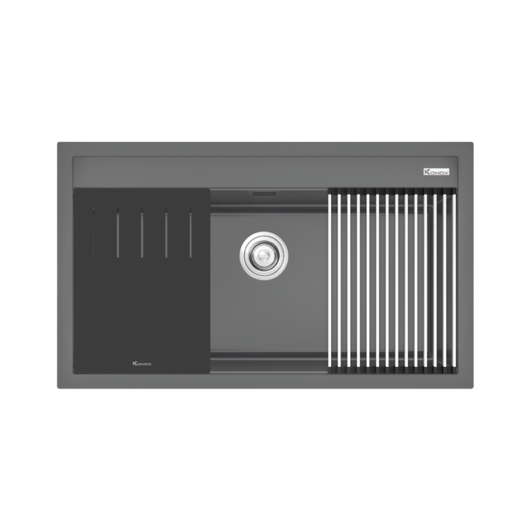Chậu rửa bát Konox Terra 860S Grey được thiết kế chuyên biệt cho lắp đặt dương mặt đá, mang lại sự chắc chắn và tính thẩm mỹ cao. Hố chậu sâu và rộng giúp hạn chế bắn nước ra ngoài trong quá trình sử dụng, đồng thời tăng hiệu quả thao tác.