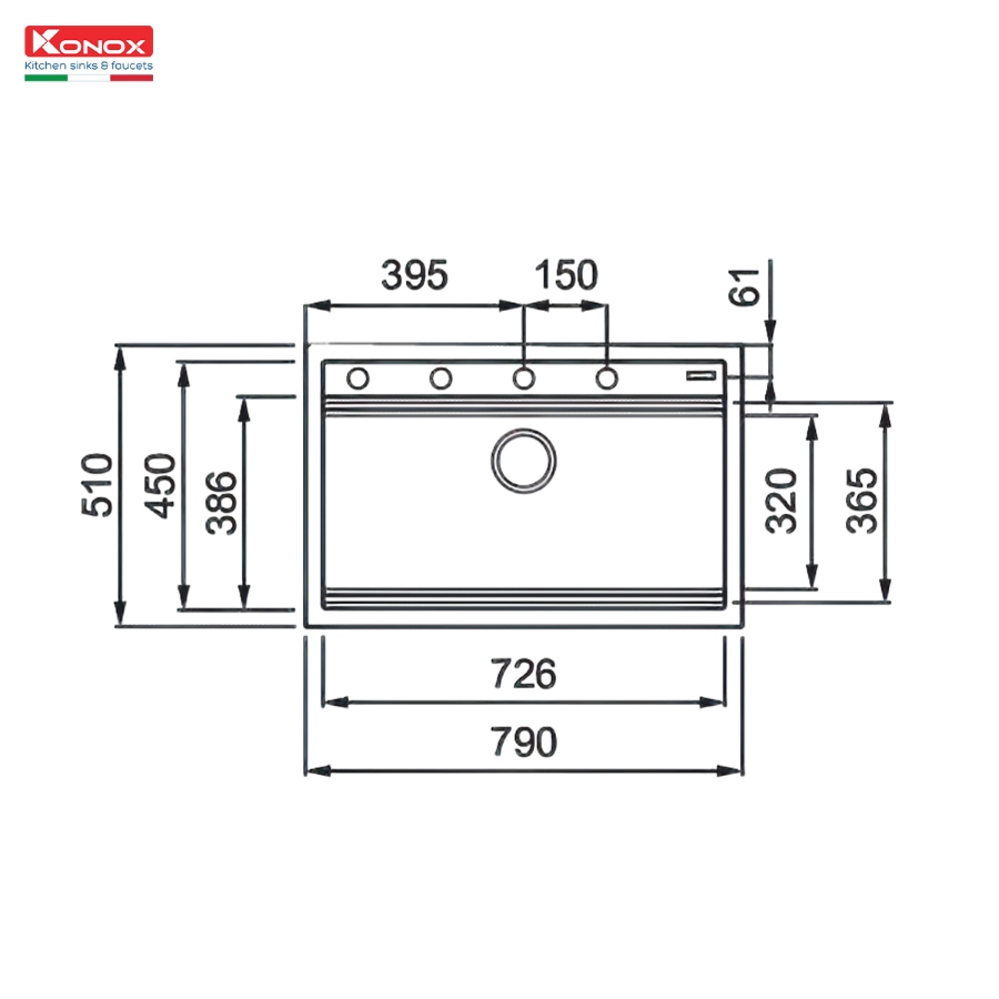 Kích thước cắt đá lắp âm: 726 x 450 mm.