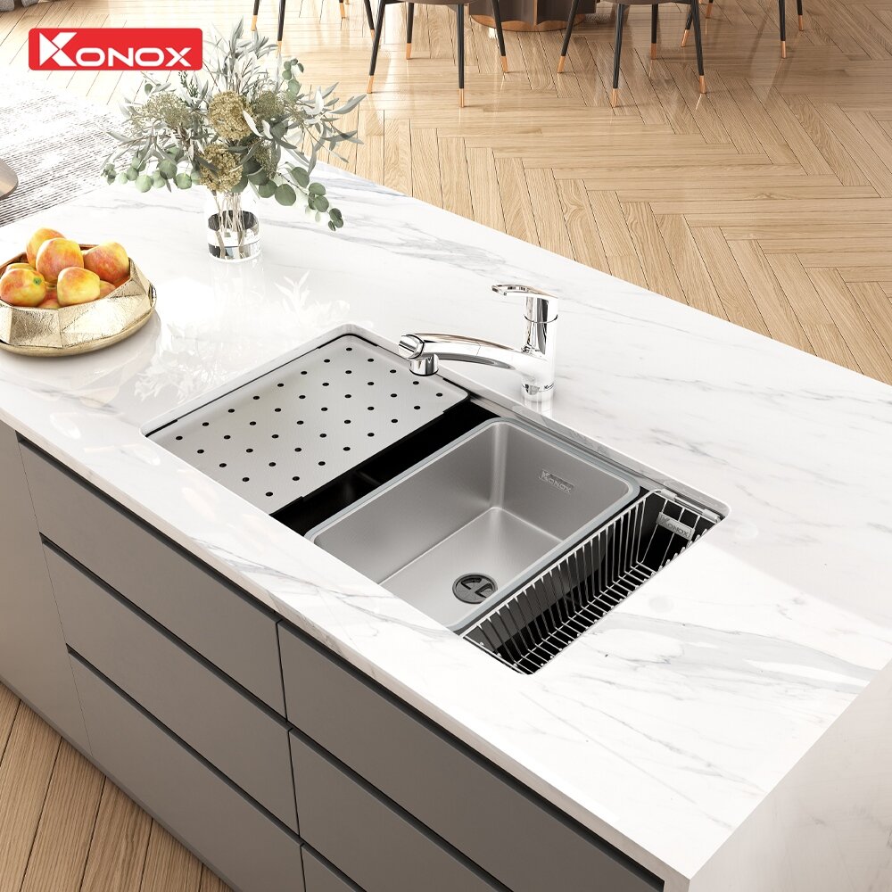 Chậu rửa bát Konox Dekor 8044SU: Đỉnh cao Workstation Sink và bề mặt hạt Linen chống xước