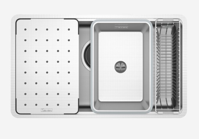 • Sử dụng phụ kiện: Nên đặt phụ kiện trượt trên gờ hạ bậc để tối ưu hóa trải nghiệm "trạm làm việc" Workstation Sink chuyên nghiệp.