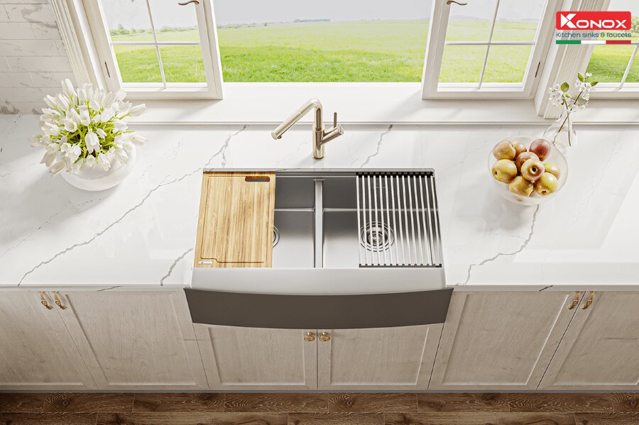Chậu rửa bát Konox KN8751DA Curve: Tuyệt tác Apron Sink cho gian bếp thượng lưu