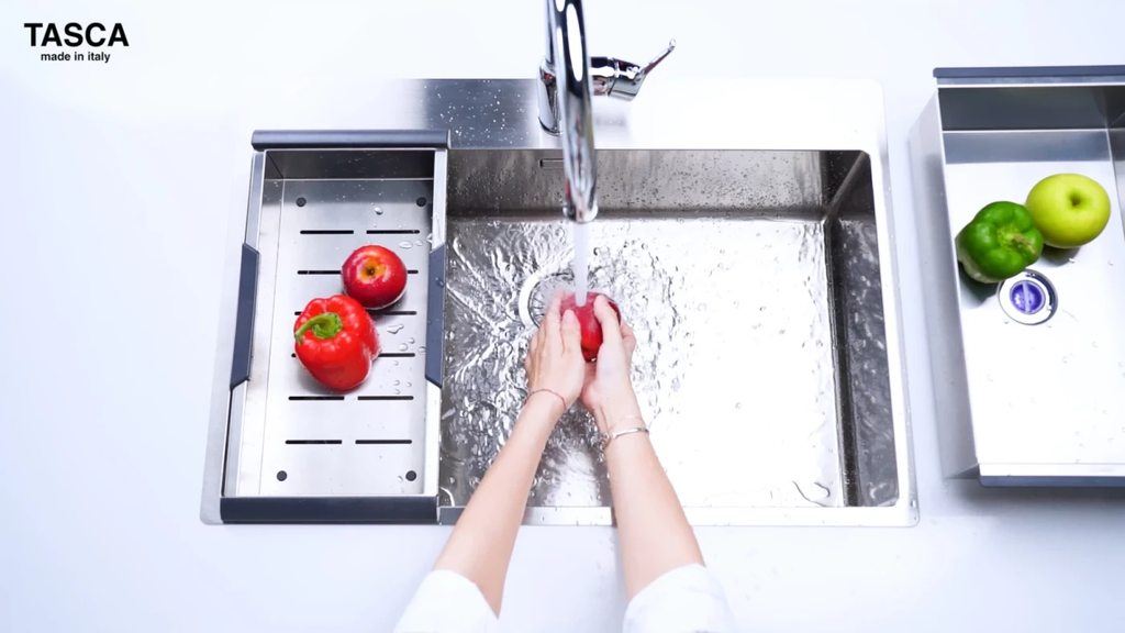 Hệ sinh thái phụ kiện: Hỗ trợ lắp thêm các phụ kiện thông minh như thớt nhựa, rổ inox chuyên dụng ngay trên mép chậu để biến bồn rửa thành trạm sơ chế đa năng.