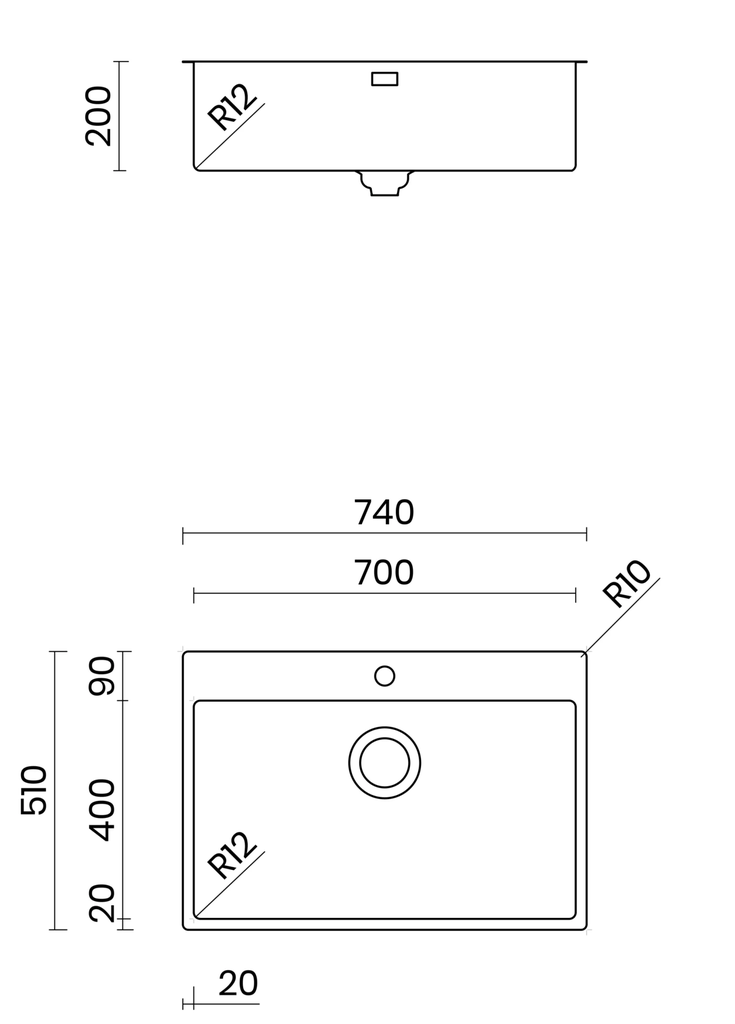 Góc bo tròn R12 & Lòng chậu sâu 200mm: Giúp việc lau chùi ngóc ngách trở nên đơn giản, đồng thời hạn chế tối đa tình trạng bắn nước ra ngoài khi xả vòi mạnh.