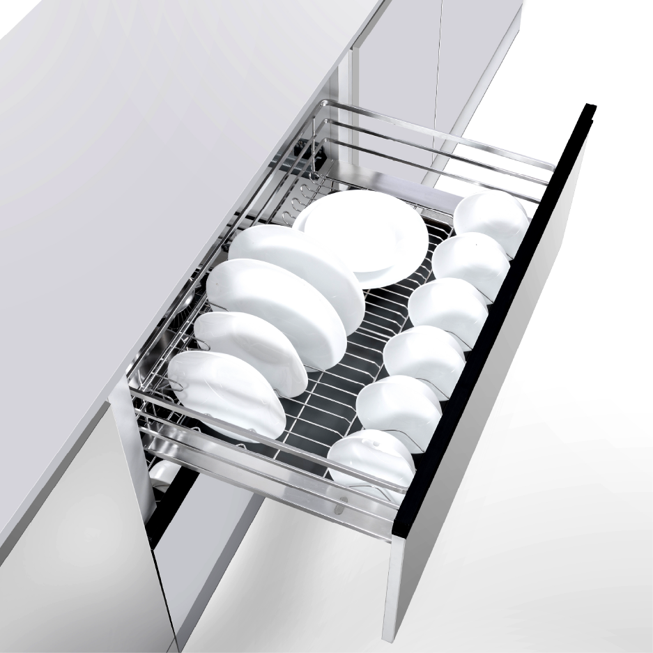 Sản phẩm được trang bị khay hứng nước bằng nhựa ABS xám mờ, có tăng cường nẹp nhôm. Khay giúp giữ nước từ bát đĩa sau khi rửa, hạn chế nước nhỏ xuống đáy tủ, từ đó bảo vệ tủ bếp khỏi ẩm mốc và hư hại.