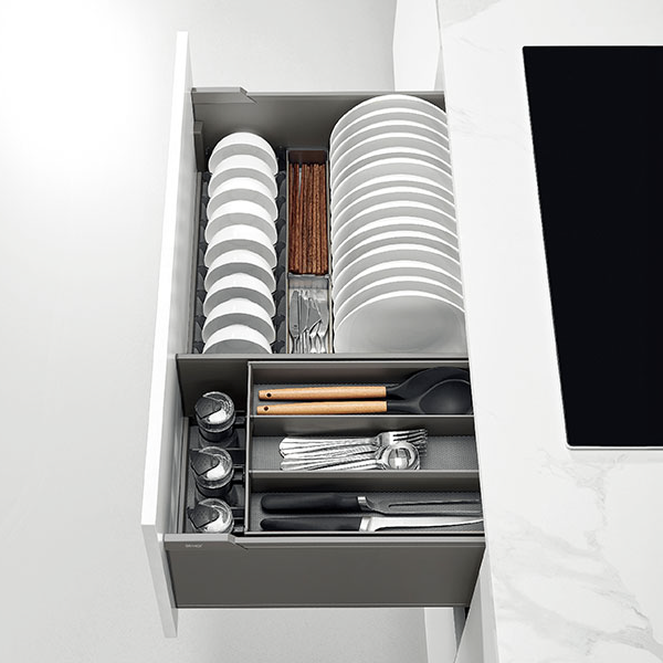 Hệ thống ngăn kéo kép thông minh: Thiết kế hộc kéo con lồng bên trong giúp bạn phân loại bát đĩa và các vật dụng nhỏ như thìa, đũa, cốc một cách khoa học, tận dụng tối đa khoang tủ 900mm.