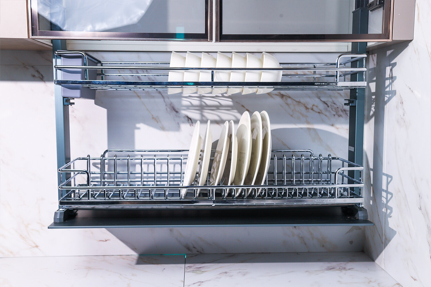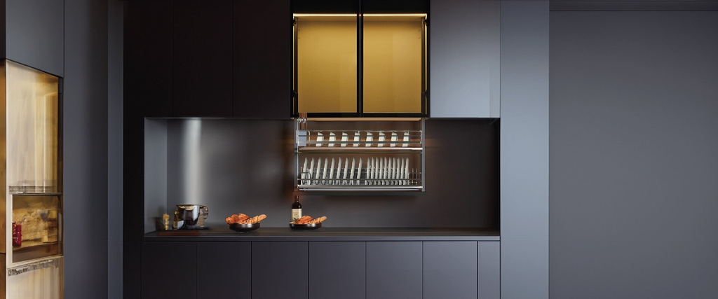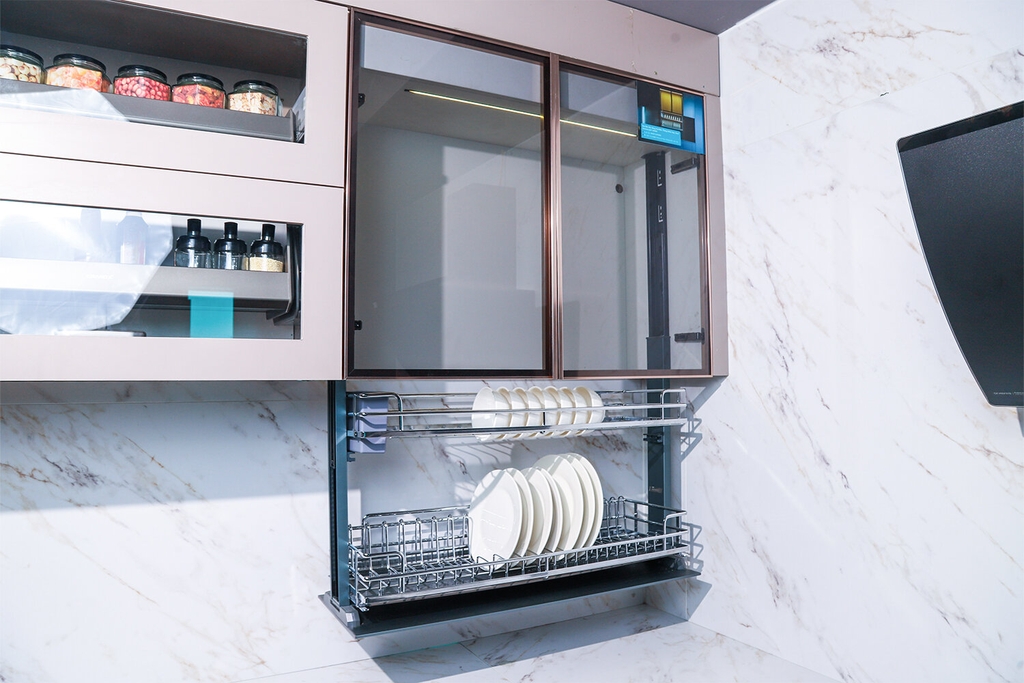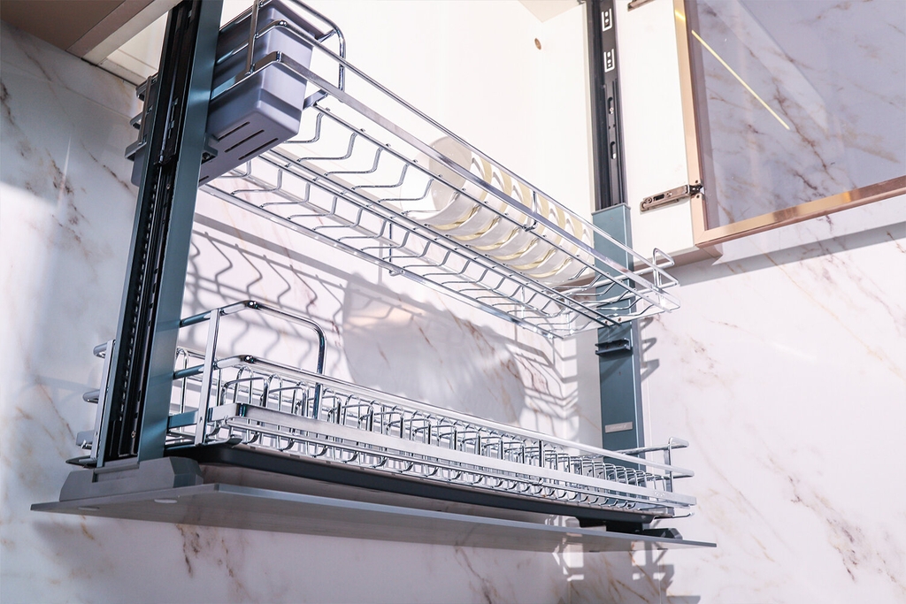Ví dụ trải nghiệm: Khi nhấn 1 chạm, giá bát nâng lên trơn tru, không rung, không gây tiếng động khó chịu, đảm bảo sự yên tĩnh cho không gian bếp.