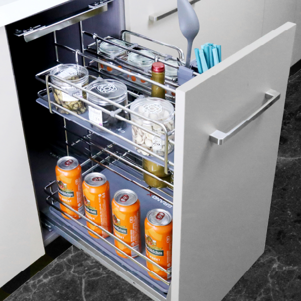 Hệ chuyển động sử dụng ray âm chất lượng cao, cho cảm giác kéo – đẩy nhẹ nhàng, ổn định và bền bỉ theo thời gian. Cơ cấu ray giúp giá hoạt động trơn tru ngay cả khi chứa nhiều dao thớt và chai lọ gia vị.