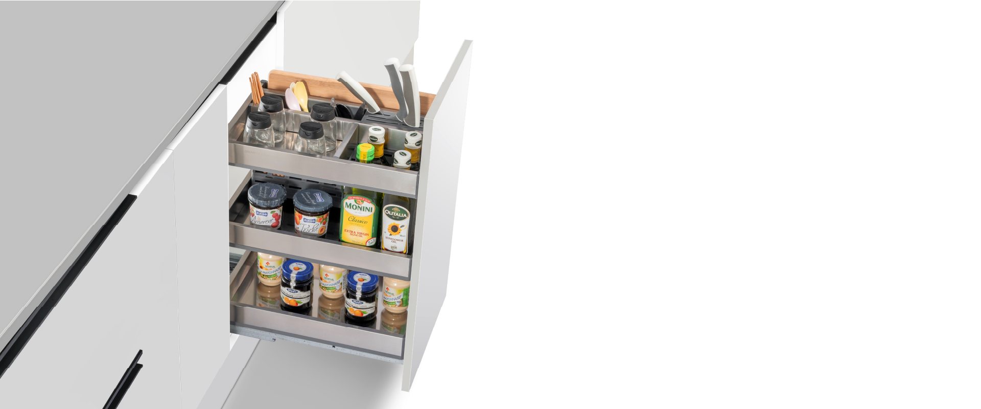 Khi lắp đặt vào tủ bếp, GrandX XK.B35S1 giúp người dùng dễ dàng lấy và cất chai lọ, gia vị hay dao thớt chỉ với một thao tác kéo nhẹ. Việc phân loại rõ ràng giúp tiết kiệm thời gian nấu nướng, giữ cho khu vực bếp luôn gọn gàng và sạch sẽ.