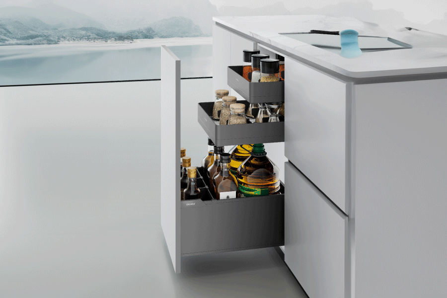 Giá gia vị 3 tầng độc lập GrandX Titanium XS.40MT1 được thiết kế với 02 ngăn kéo trên thu gọn trong hộc tủ treo kết hợp 01 ngăn kéo dưới độc lập, tạo nên không gian lưu trữ khoa học và linh hoạt. Cấu trúc này giúp phân loại rõ ràng các lọ gia vị, chai dầu và vật dụng nhà bếp có kích thước khác nhau, mang lại sự gọn gàng và tiện lợi khi sử dụng.
