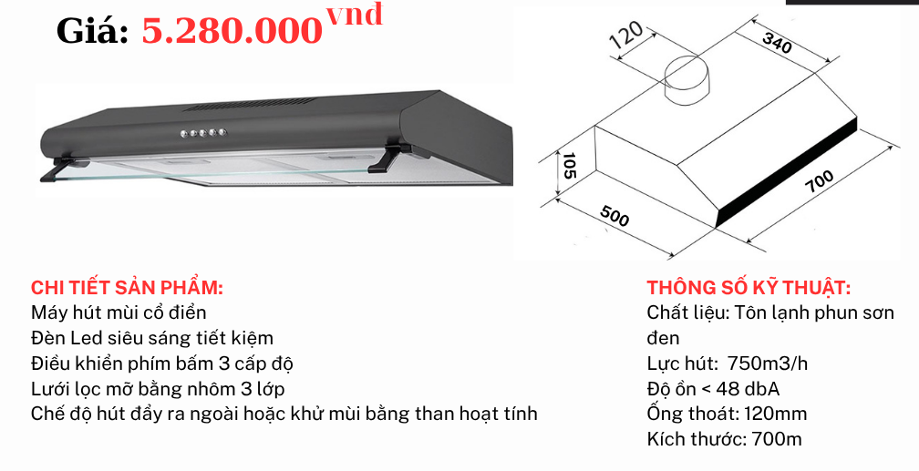 Công suất hút 750 m³/h, xử lý tốt mùi dầu mỡ, khói và hơi nước.