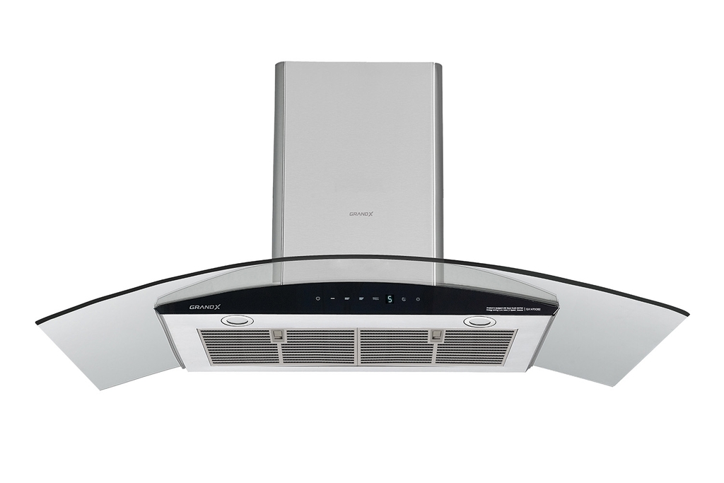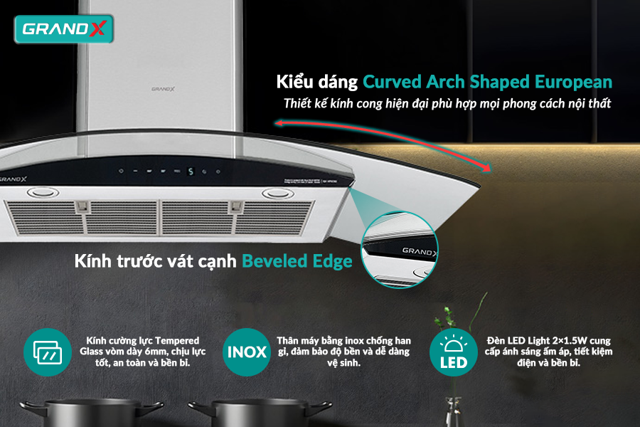 Máy hút mùi kính cong GrandX GX H90C62S gây ấn tượng ngay từ cái nhìn đầu tiên nhờ đường cong kính chuẩn Curved Arch European, tạo điểm nhấn cao cấp cho mọi căn bếp.
