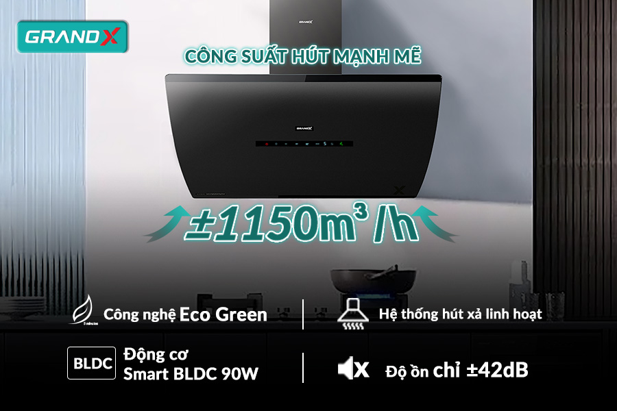 Công suất hút ±1150m³/h—lôi sạch mùi dầu mỡ ngay sau vài giây.