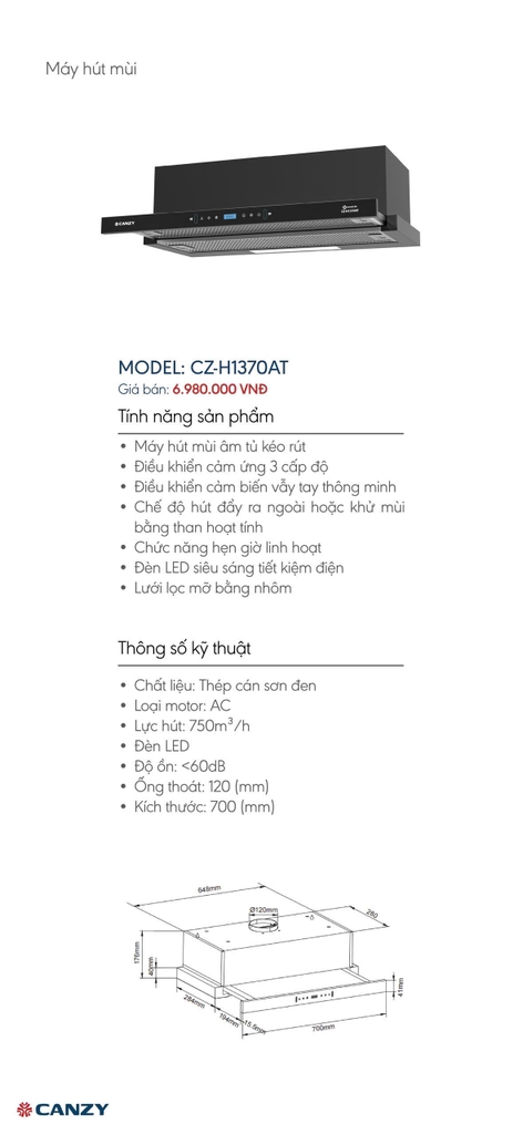 Canzy CZ H1370AT là lựa chọn lý tưởng cho những căn bếp hiện đại tối ưu không gian. Với sự kết hợp giữa thiết kế âm tủ sang trọng, công nghệ vẫy tay thông minh và vận hành siêu êm, sản phẩm cam kết mang lại không gian nấu nướng trong lành, sạch thoáng và đầy cảm hứng.