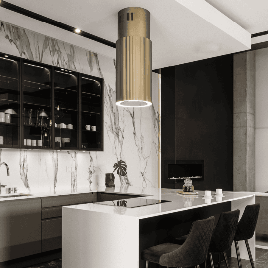 Sự tỉ mỉ trong thiết kế còn thể hiện qua khả năng tùy chỉnh chiều cao từ 800mm đến 1100mm. Khi được lắp đặt treo trần độc lập, Monogold K382G kết hợp hoàn hảo với các chi tiết mạ vàng khác trong phòng bếp như vòi rửa hay tay nắm tủ, tạo nên một tổng thể nội thất đồng nhất và đẳng cấp vượt thời gian.