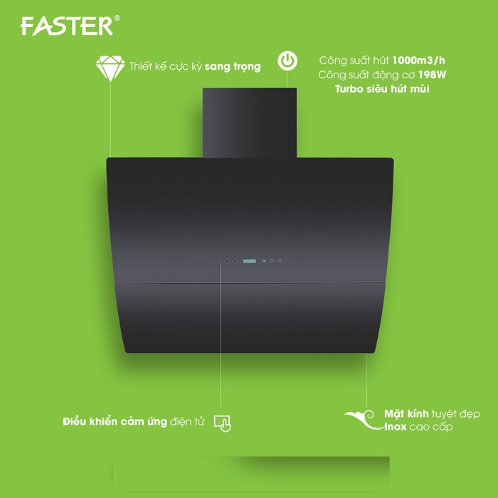 Máy hút mùi Faster FS-90CG BLACK là dòng máy hút mùi vát áp tường cao cấp, được sản xuất theo dây chuyền công nghệ hiện đại tiêu chuẩn quốc tế. Với tông màu đen nhám lộng lẫy, sản phẩm không chỉ xử lý khói mùi hiệu quả mà còn là một vật trang trí đẳng cấp, tôn lên vẻ sang trọng cho không gian bếp hiện đại.