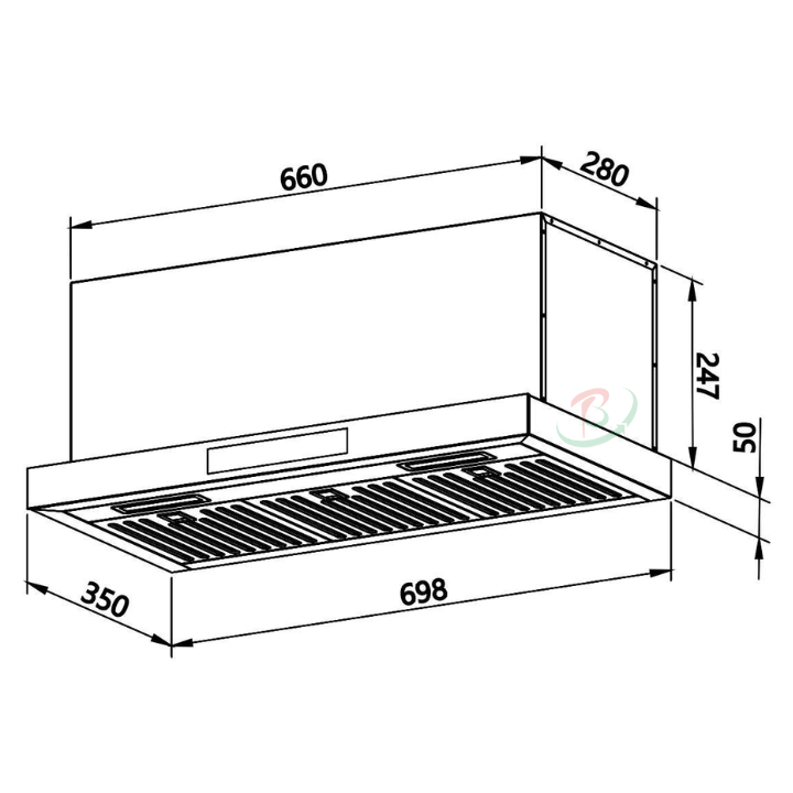 Điểm nổi bật nhất về cấu trúc là chiều sâu đặc biệt chỉ 350 mm, giúp máy lắp đặt hoàn toàn vừa vặn trong các khoang tủ bếp hiện đại, tiết kiệm tối đa diện tích. Hệ thống lưới lọc bằng thép phủ sơn tĩnh điện bền bỉ, ngăn chặn dầu mỡ xâm nhập vào động cơ và cực kỳ dễ dàng tháo rời để vệ sinh. Máy hỗ trợ linh hoạt cả hai hệ thống hút xả: tuần hoàn qua than hoạt tính hoặc thông gió qua ống thoát Ø150 mm.