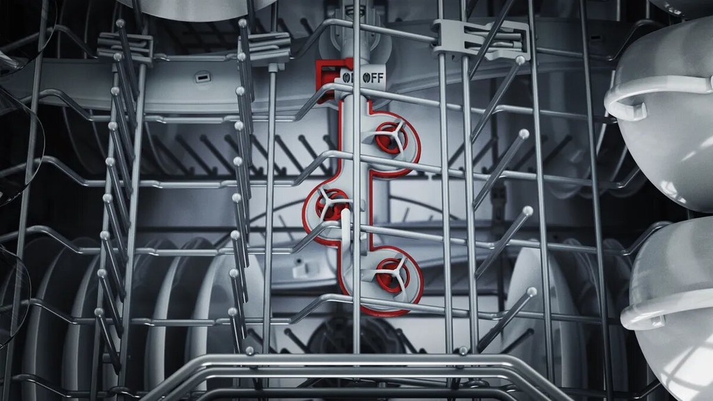 Tính năng: Tăng cường áp lực nước tại các vùng cụ thể. Cơ chế kỹ thuật: IntensiveZone sử dụng áp lực nước mạnh và nhiệt độ cao ở giàn dưới. Extra Clean Zone ở giàn giữa tích hợp 3 vòi phun xoay bổ sung lực đẩy thủy lực. Lợi ích đời thực: Mọi vết dầu mỡ cứng đầu, thực phẩm cháy sém trên nồi chảo hay vết trà, cà phê trên ly tách đều được đánh bay mà không cần tráng tay trước.