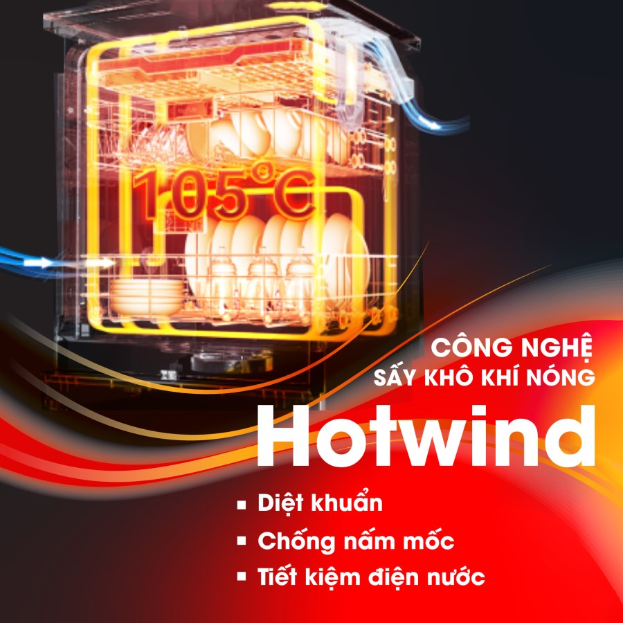 Công nghệ sấy khô khí nóng PTC Hotwind: Bát đĩa được sấy khô hoàn toàn 100% bằng luồng khí nóng liên tục, loại bỏ hoàn toàn vi khuẩn và ngăn ngừa nấm mốc phát triển.