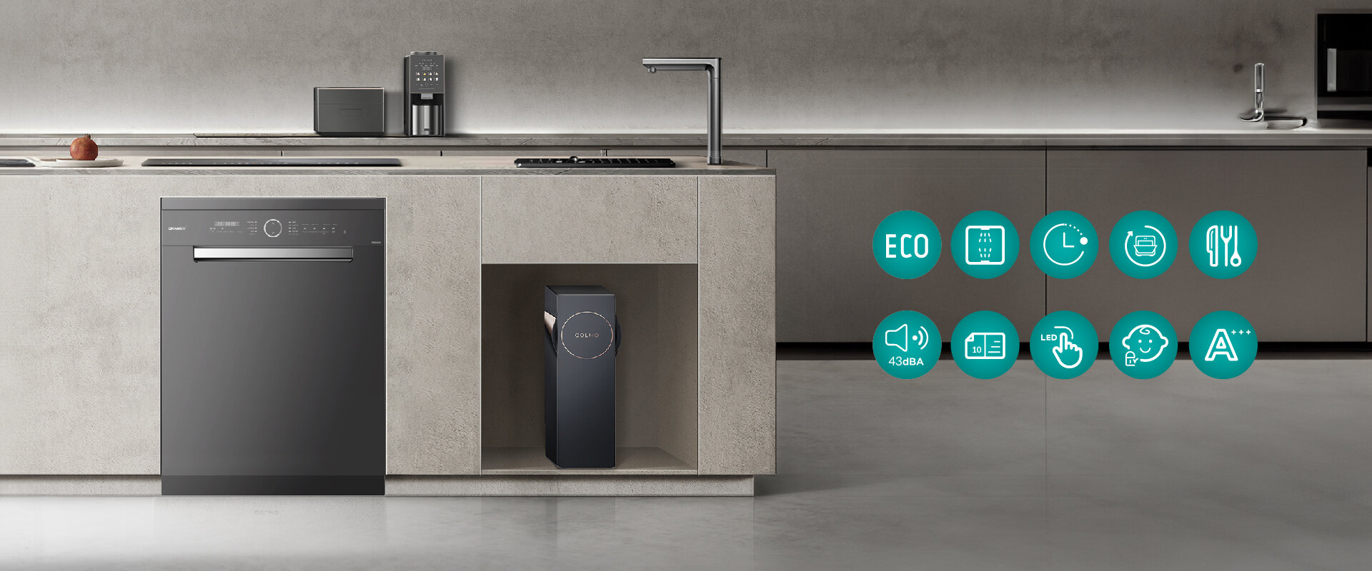Máy được trang bị hệ thống vòi phun kép đa chiều Dual Vortex Wash. Dưới áp lực nước cực mạnh, các tia nước xoáy sâu vào từng ngóc ngách của bát đĩa, đánh bật ngay cả những vết dầu mỡ bò, tinh bột khô cứng mà không cần tráng tay trước khi xếp vào máy. Vận hành hệ thống này là động cơ Synchronous DUAL BLDC thế hệ mới. Với công nghệ Eco Silence, máy hoạt động siêu tĩnh lặng với độ ồn ≤43dB, đồng thời tiết kiệm 50% điện năng và thời gian, giúp máy đạt tiêu chuẩn năng lượng khắt khe nhất A+++.