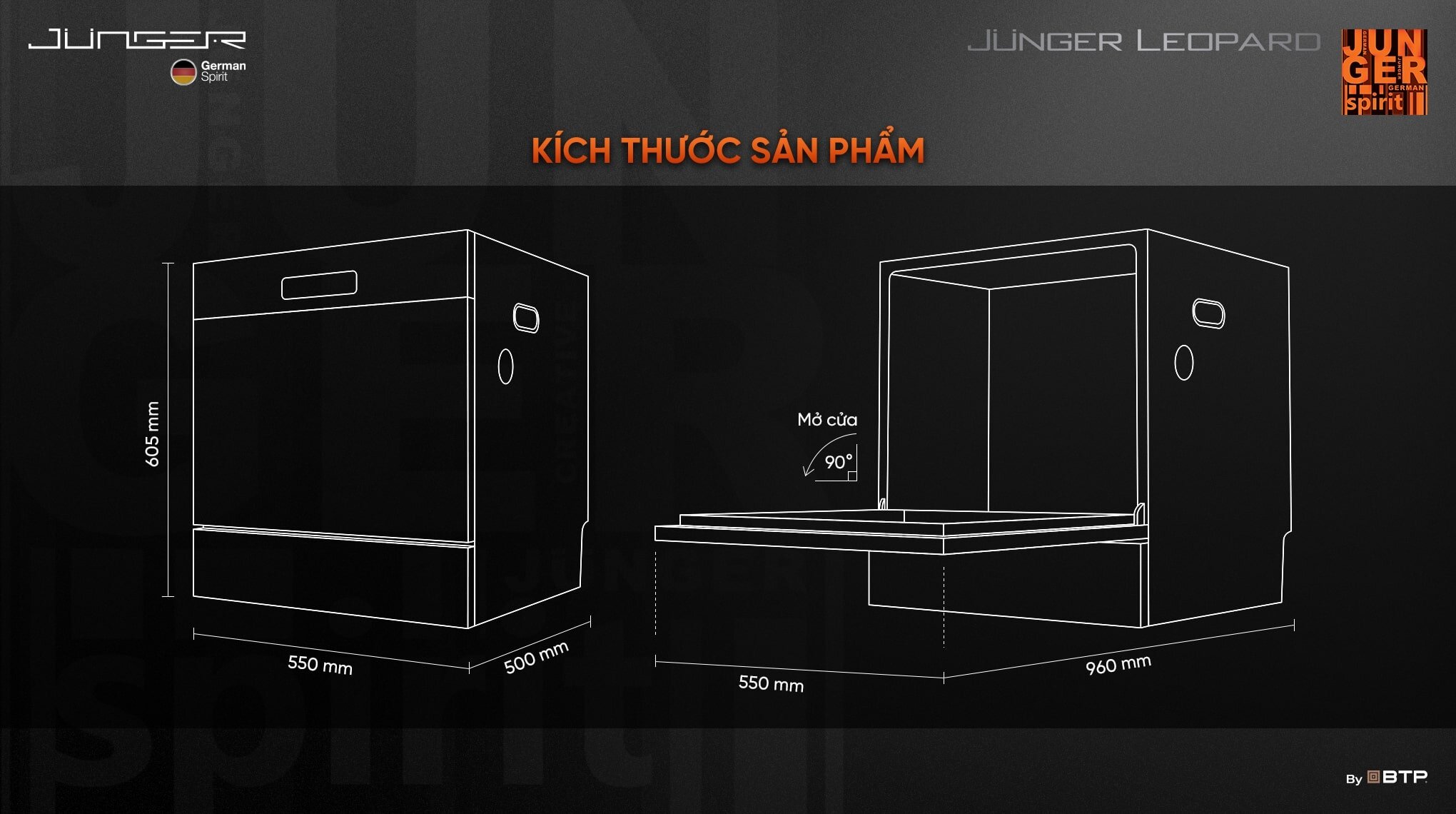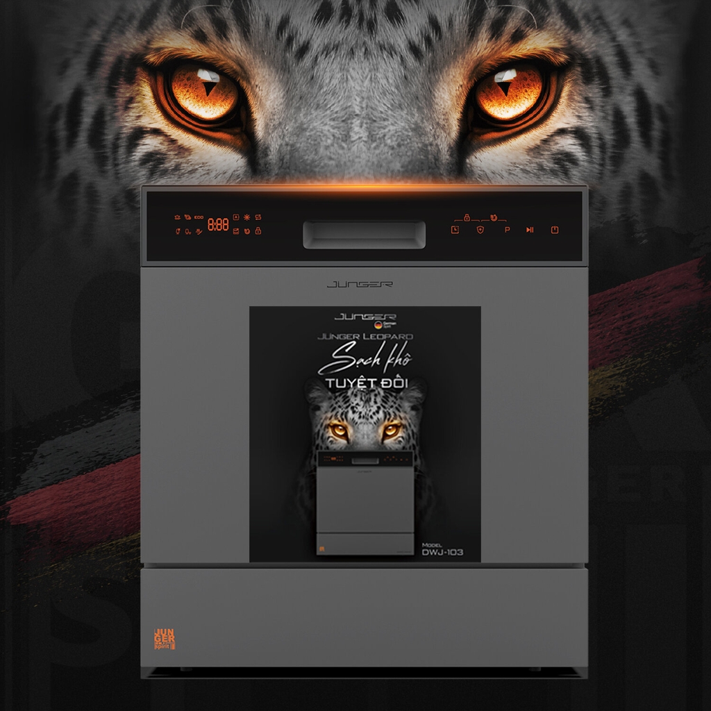 Máy rửa bát Junger JG Leopard DWJ-103 là dòng máy rửa bát dung tích 12–13 bộ châu Âu, phù hợp cho gia đình Việt từ 3–4 bữa ăn mỗi ngày. Sản phẩm được phát triển theo tiêu chuẩn công nghệ Đức, tích hợp loạt công nghệ rửa – sấy – khử khuẩn tiên tiến, mang lại hiệu quả làm sạch vượt trội, tiết kiệm điện nước và đảm bảo an toàn sức khỏe.
