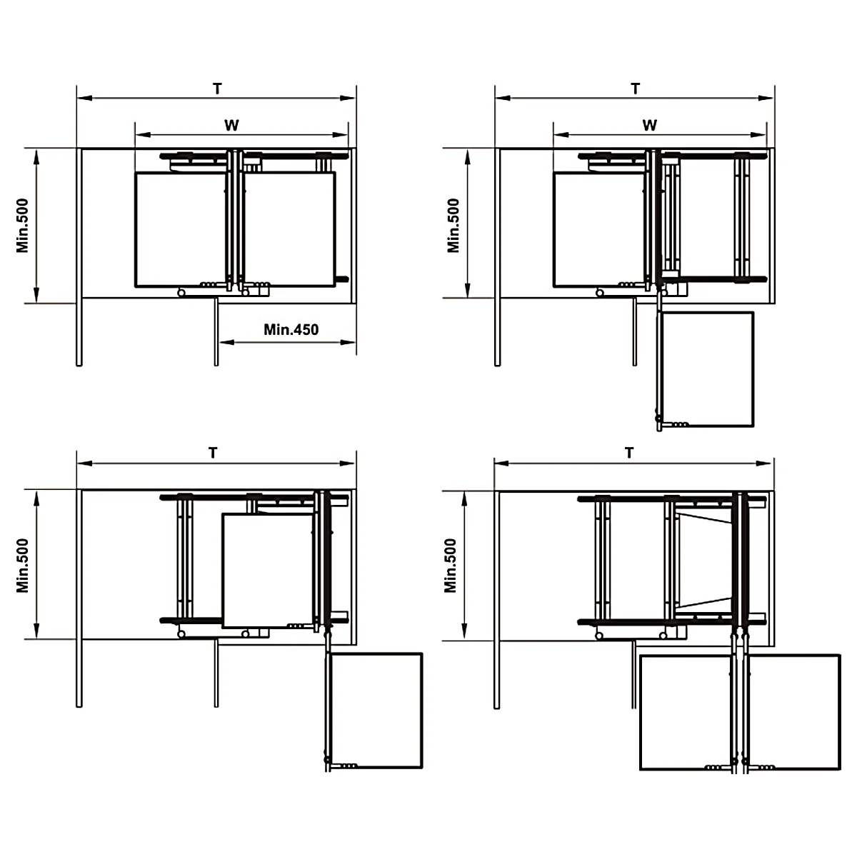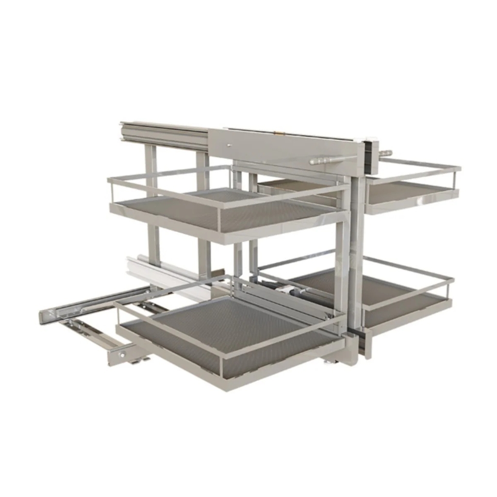 Hệ thống mở toàn phần 4 khay — Lợi ích: Khi mở cánh tủ, cơ chế liên hoàn sẽ đưa toàn bộ 4 khay chứa ra ngoài tầm mắt. Bà chủ không còn phải cúi người hay chui vào góc sâu để tìm kiếm nồi chảo hay chai lọ.