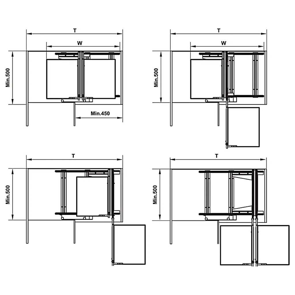 Thông số lọt lòng: Khoang tủ cần đạt chiều rộng phủ bì 900mm và chiều sâu lọt lòng tối thiểu 500mm để hệ thống khay có đủ hành trình xoay và kéo ra ngoài.