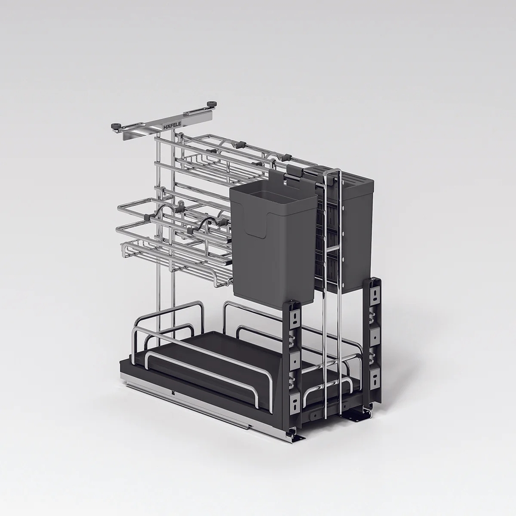 Hafele OMERO MULTI 547.11.002 là minh chứng cho việc tối ưu hóa diện tích tủ bếp dưới. Chỉ với khoang tủ rộng 250mm, sản phẩm mang đến một hệ thống lưu trữ đa năng bậc nhất, giúp bà chủ sắp xếp từ gia vị, dao thớt đến đũa thìa một cách khoa học nhờ thiết kế nan Ovan hiện đại và chất liệu Inox 304 vĩnh cửu.