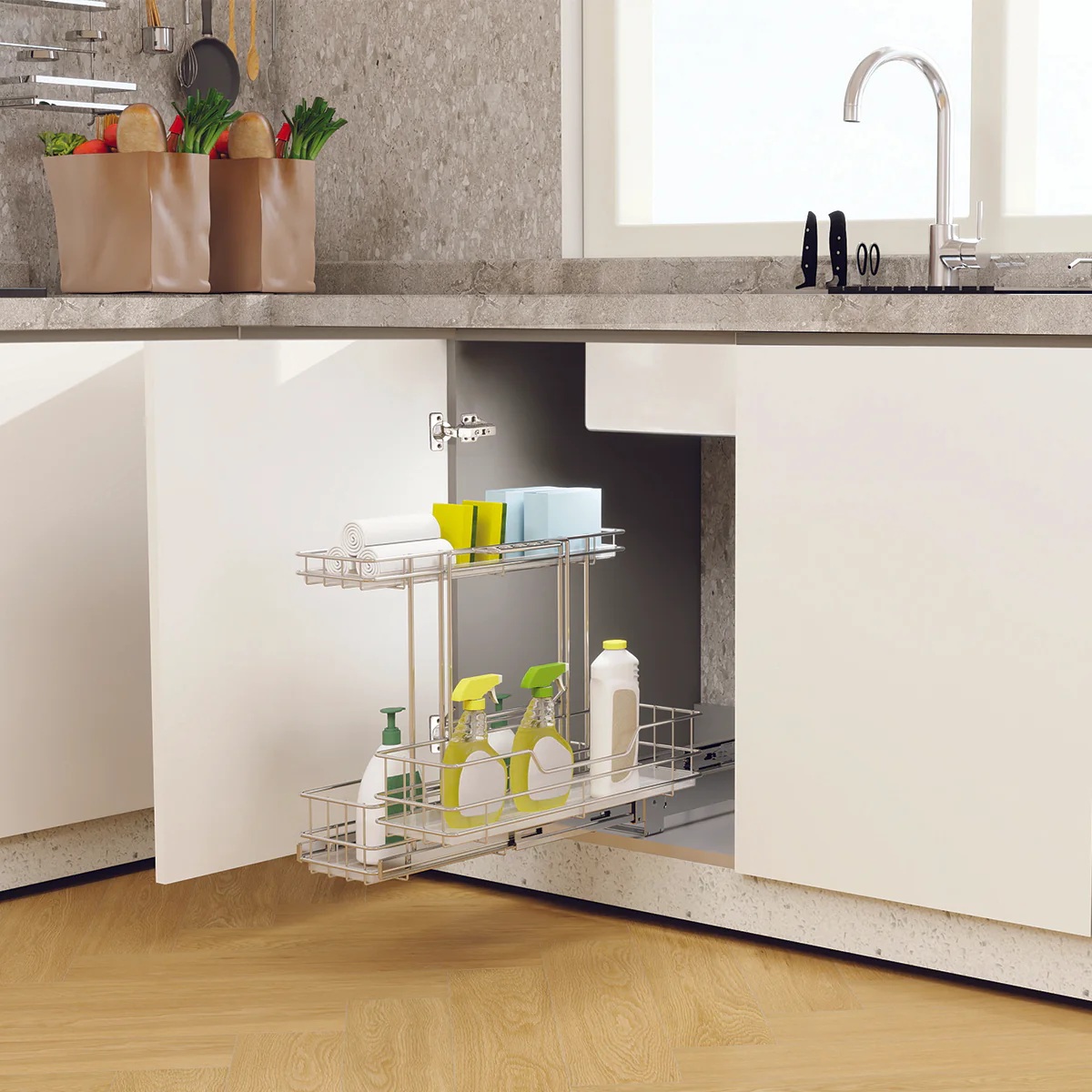 Phù hợp: Khoang tủ dưới chậu rửa hoặc các module tủ bếp dưới cần lưu trữ dụng cụ vệ sinh gọn gàng.