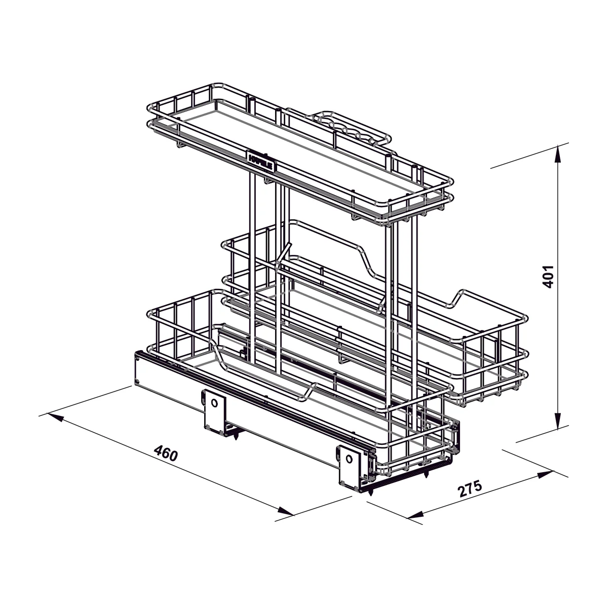 | Trọn bộ đóng gói | Bộ ray, 2 rổ cố định, 1 rổ di động, 3 khay hứng, bộ vít |