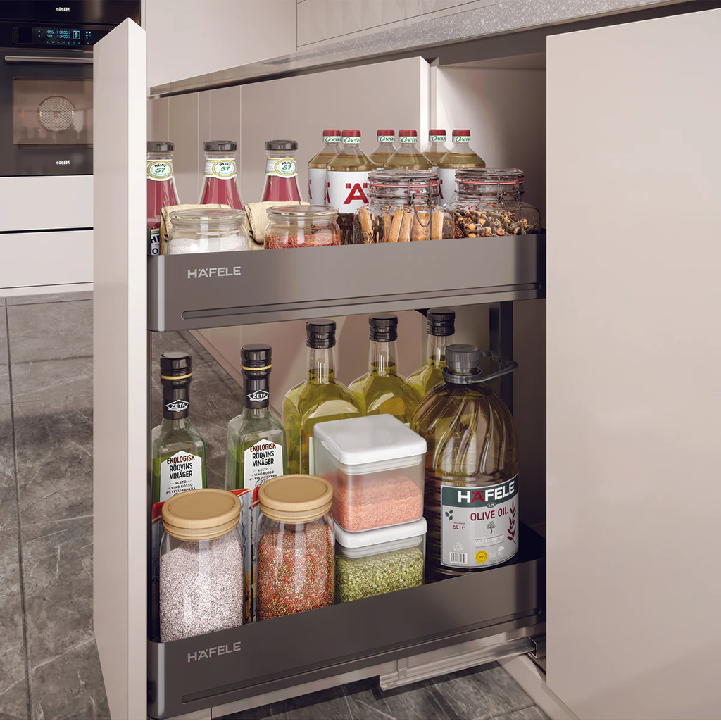 Hafele Utensio Plus H2 (545.14.324) mang đến sự phóng khoáng trong tư duy tổ chức gian bếp với chiều rộng khoang tủ 400mm. Không bị giới hạn bởi các ô chia sẵn, sản phẩm cung cấp một diện tích phẳng rộng lớn, cho phép bà chủ tự do sắp xếp mọi dụng cụ theo thói quen cá nhân, mang lại vẻ đẹp tối giản và hiện đại cho tủ bếp dưới.
