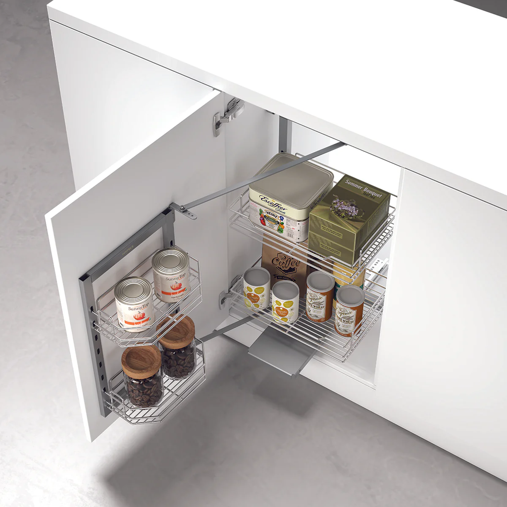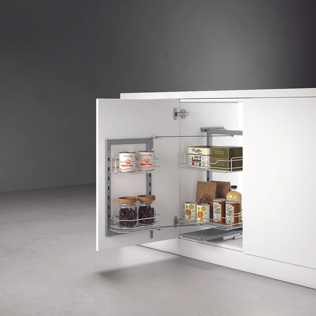 Hafele DOLCE 548.65.006 mang đến sự đột phá trong việc tổ chức thực phẩm khô cho hệ tủ bếp dưới. Với cơ chế cánh mở xoay độc đáo, toàn bộ hệ thống rổ sẽ chuyển động nhịp nhàng theo cánh cửa tủ, giúp bà chủ tiếp cận thực phẩm một cách nhanh chóng và đầy cảm hứng ngay trong tầm tay.