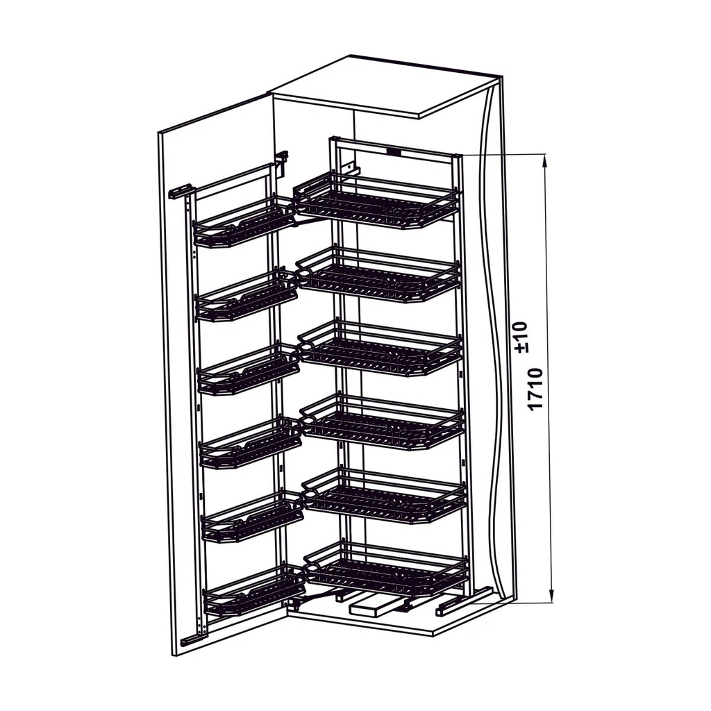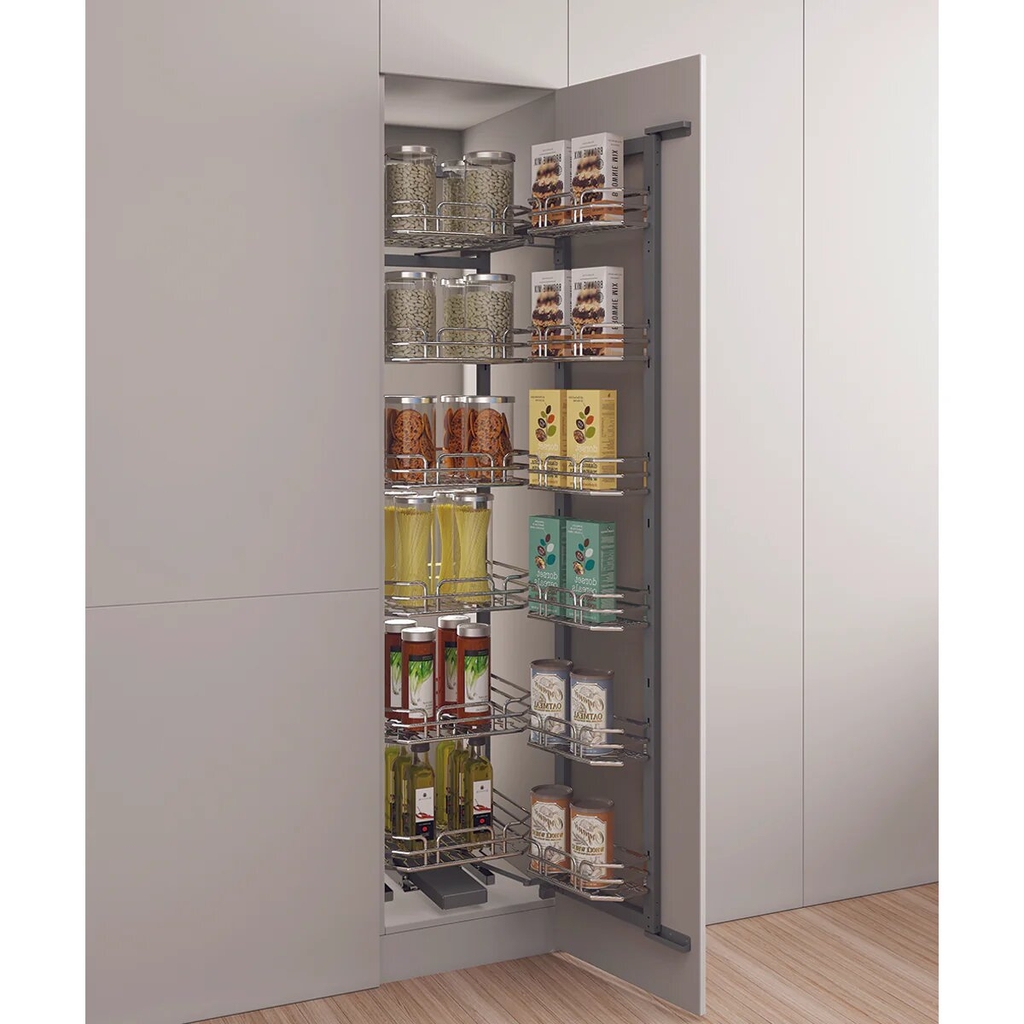 Tiếp cận dễ dàng: Khi mở cánh tủ, hệ rổ bên trong sẽ được kéo ra phía trước đồng thời với các rổ trên cánh, giúp mọi thứ nằm ngay trước tầm mắt, thuận tiện cho việc lấy đồ ngay cả ở tầng cao nhất.