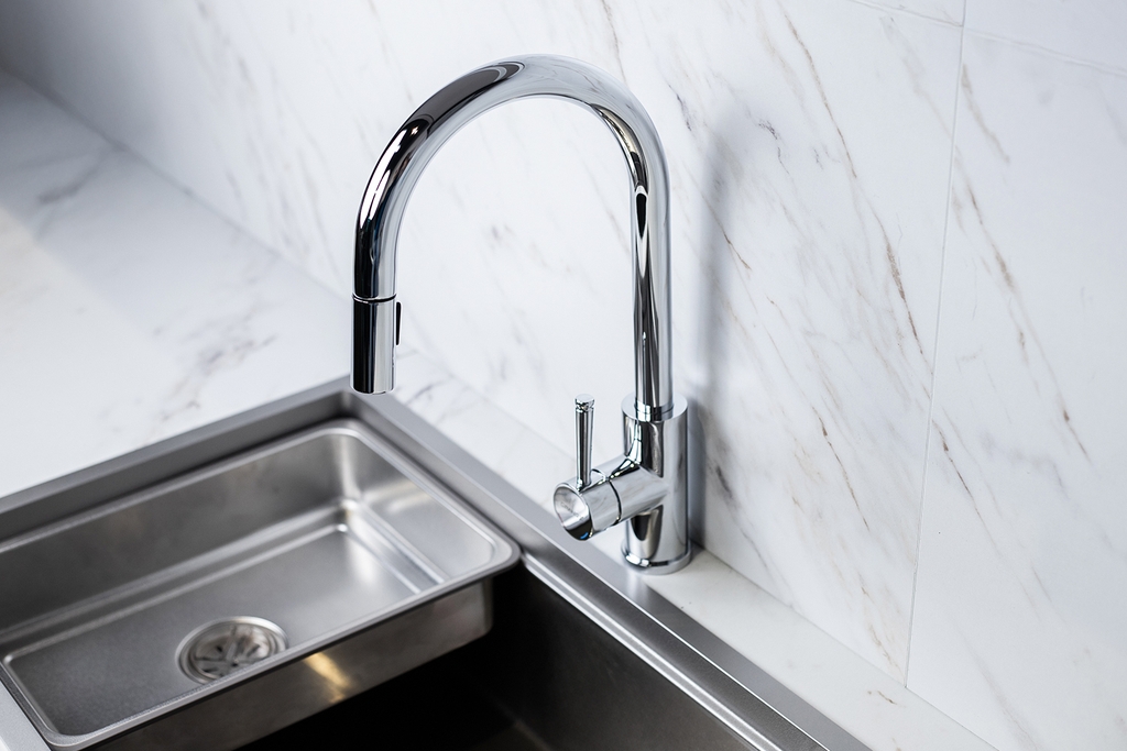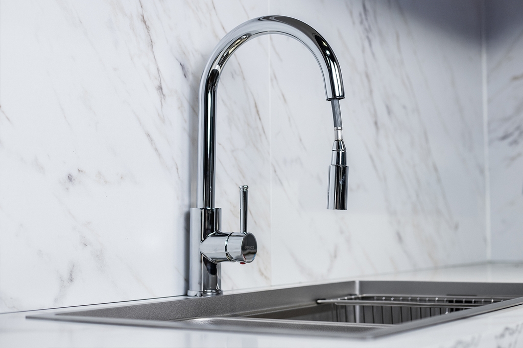 Điểm đắt giá nhất của GXF05 chính là khả năng rút kéo đầu vòi (Pull-out spray). Bạn có thể dễ dàng kéo đầu vòi ra xa để xịt rửa các góc khuất của chậu, vệ sinh mặt bàn đá xung quanh hoặc đổ nước vào các nồi chảo lớn đặt trên bàn bếp. Sau khi dùng, quả đối trọng thông minh sẽ giúp dây rút tự động thu hồi về vị trí cũ một cách nhẹ nhàng và chuẩn xác.
